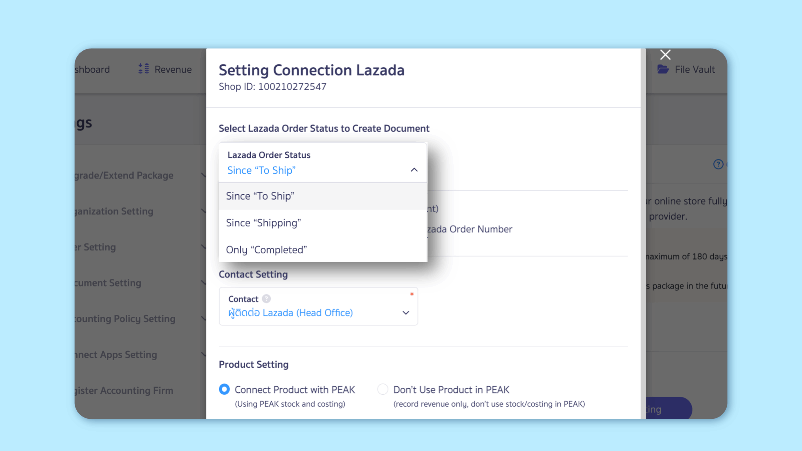 Highlight: A new tab now displays Lazada order data directly on the API connection page, allowing users to instantly see which orders have been used to create documents in PEAK—helping monitor document status and API activity in one view.