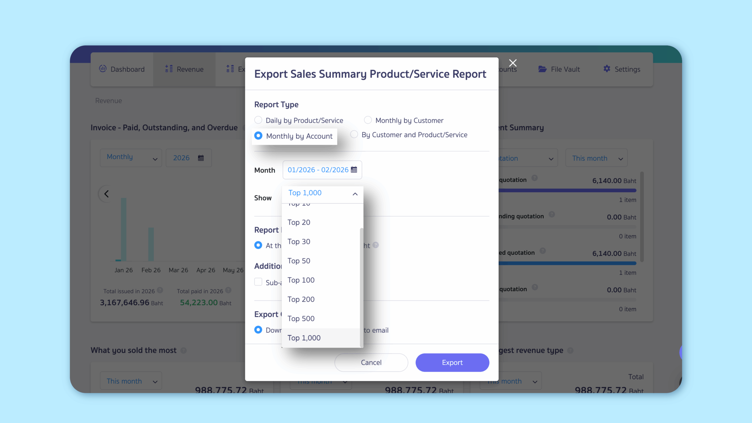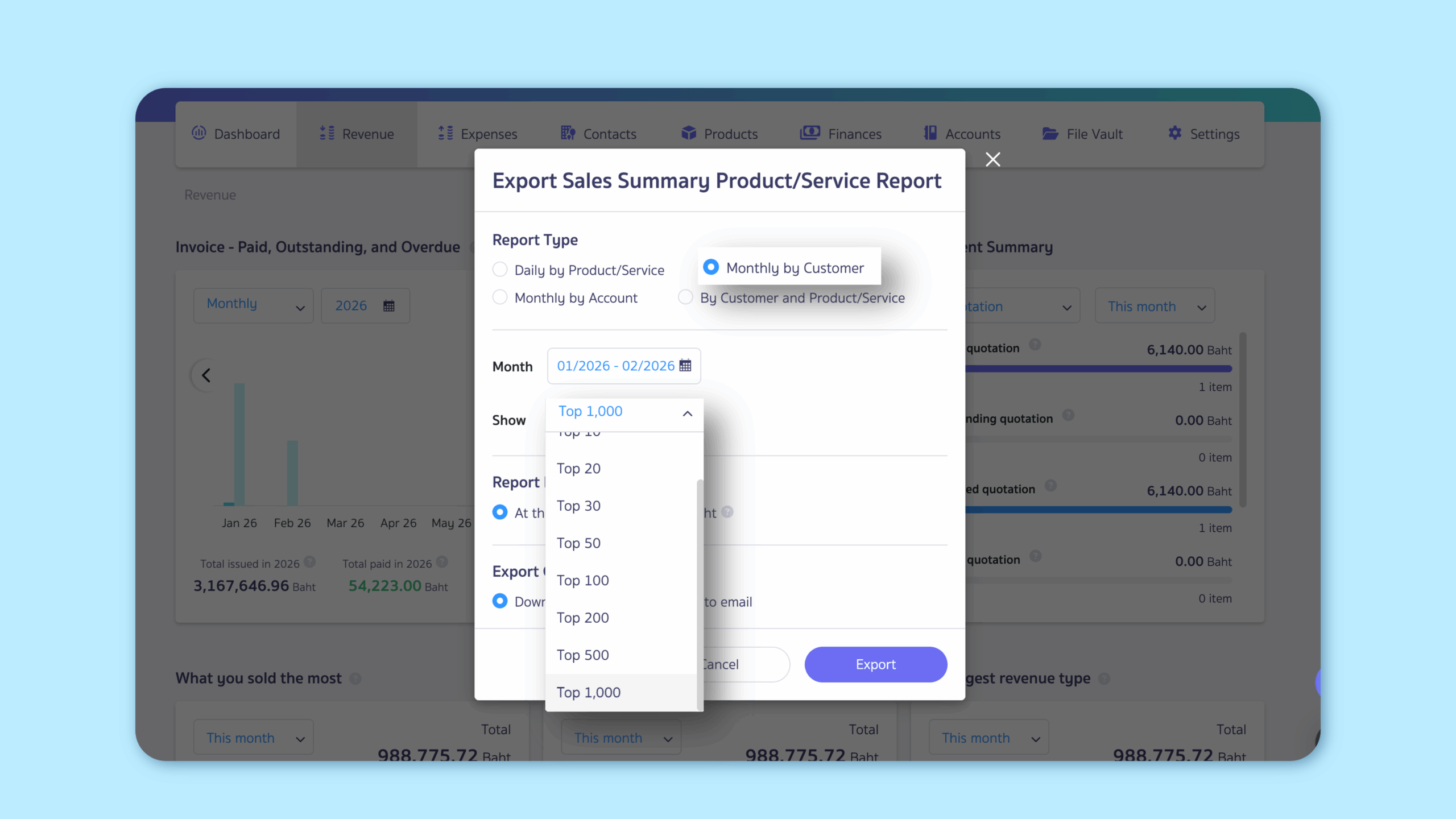 Highlight: The Export Sales Summary Product/Service Report modal has been redesigned with display options of 100, 200, 500, or up to 1,000 entries for: