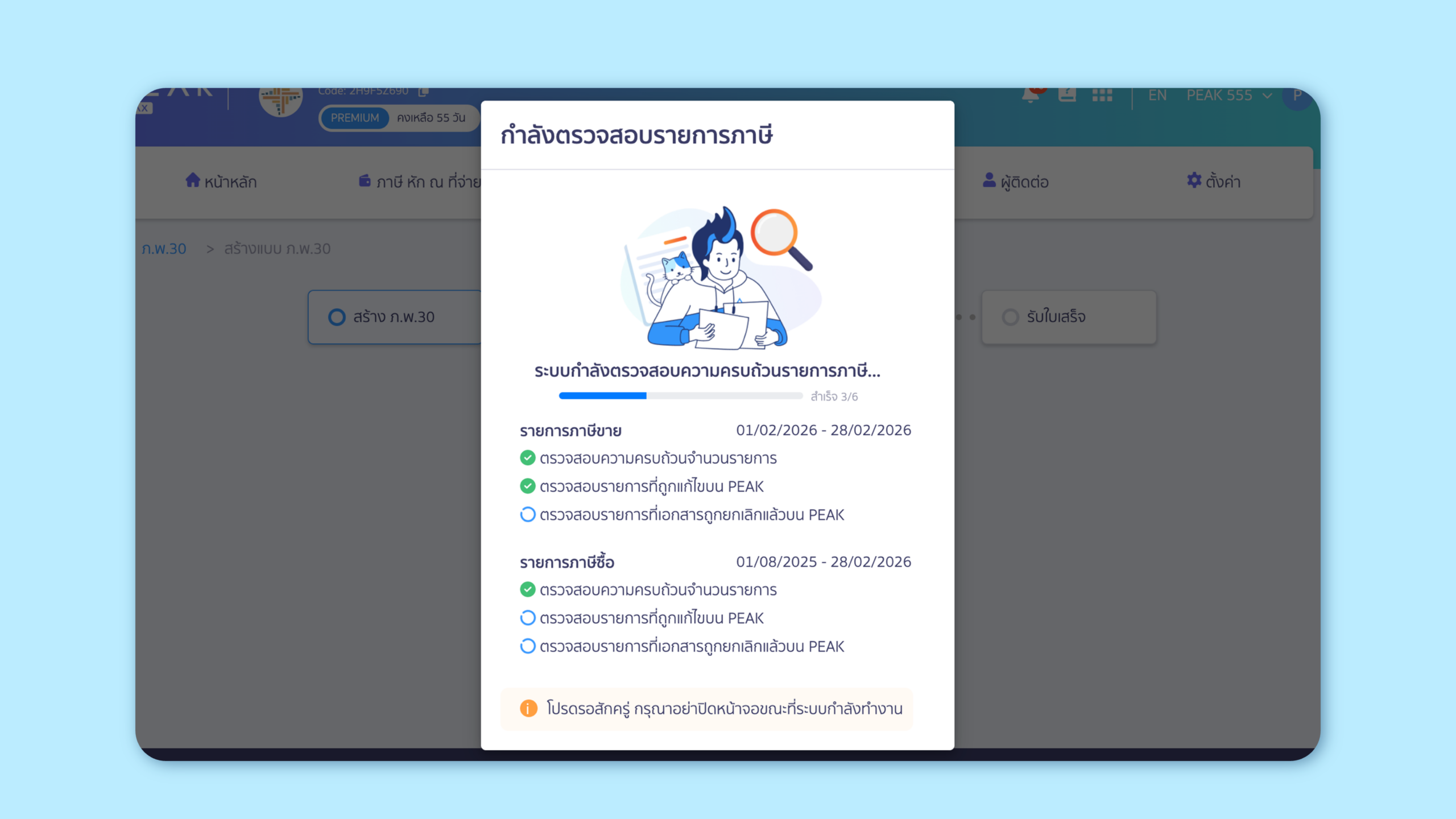 Highlight : ทุกครั้งที่สร้างแบบภาษีระบบจะตรวจสอบและอัปเดตรายการที่ถูกแก้ไขหรือยกเลิกจากระบบบัญชีให้อัตโนมัติ ในกรณีที่ผู้ใช้งานไม่ได้เปิดใช้งานการดึงข้อมูลอัตโนมัติใน PEAK TAX เพื่อให้ข้อมูลตรงกันก่อนอนุมัติแบบภาษี