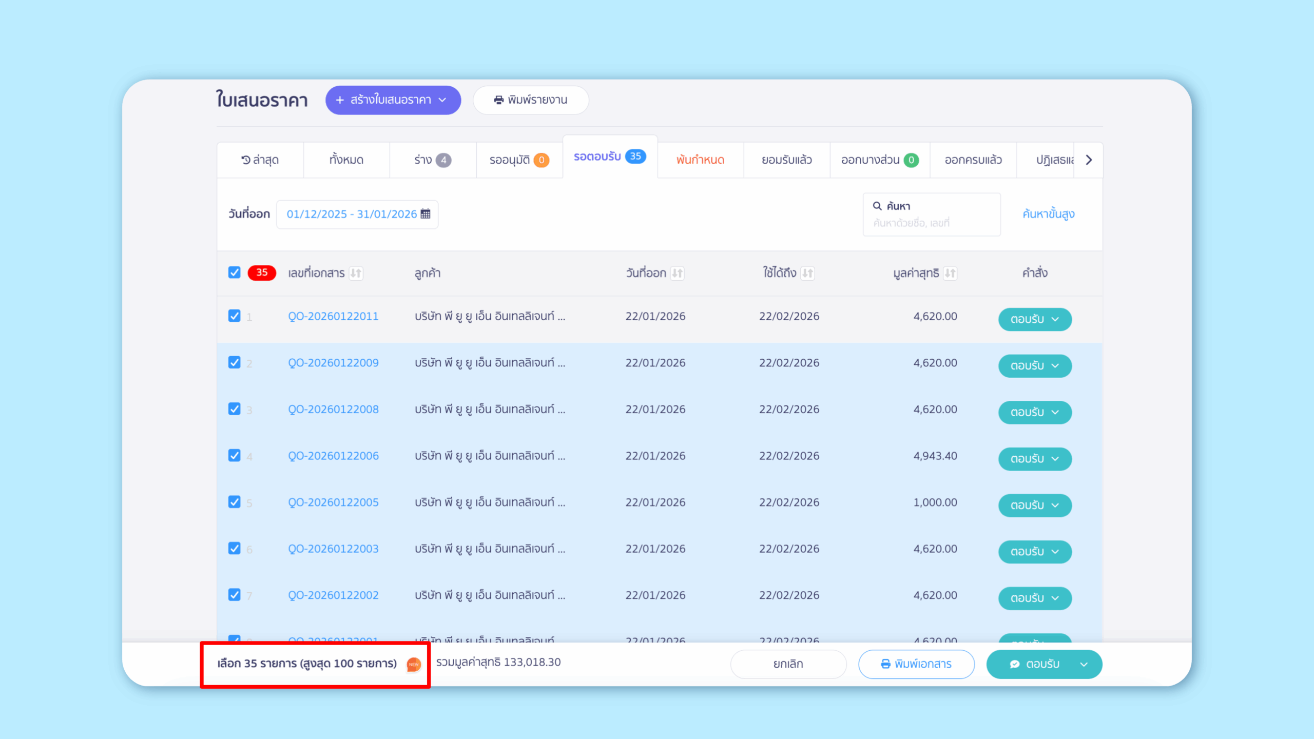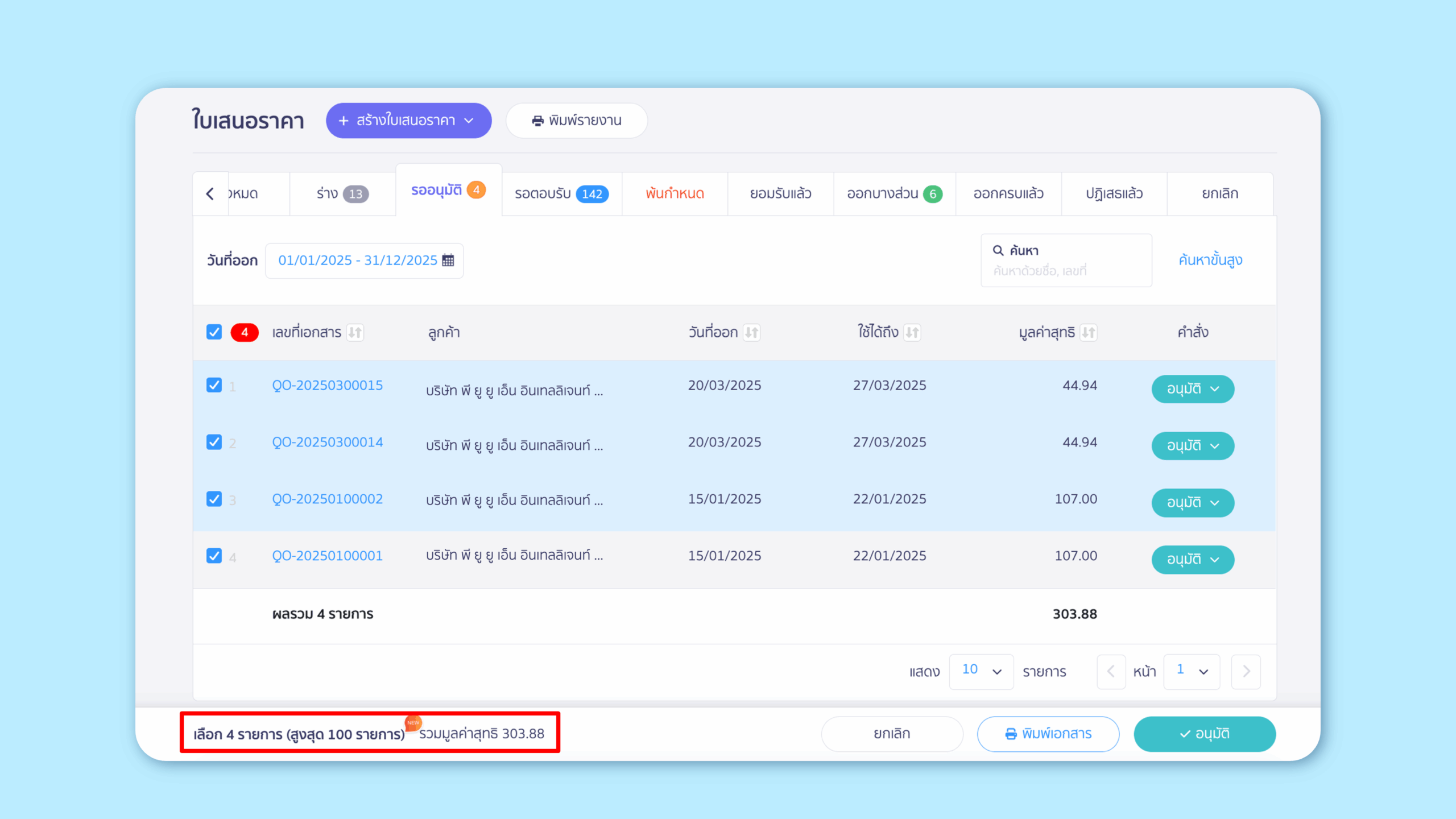 6. ปรับการพิมพ์และอนุมัติเอกสารพร้อมกันสูงสุดครั้งละ 100 รายการ ช่วยประหยัดเวลาในการพิมพ์เอกสารจำนวนมาก