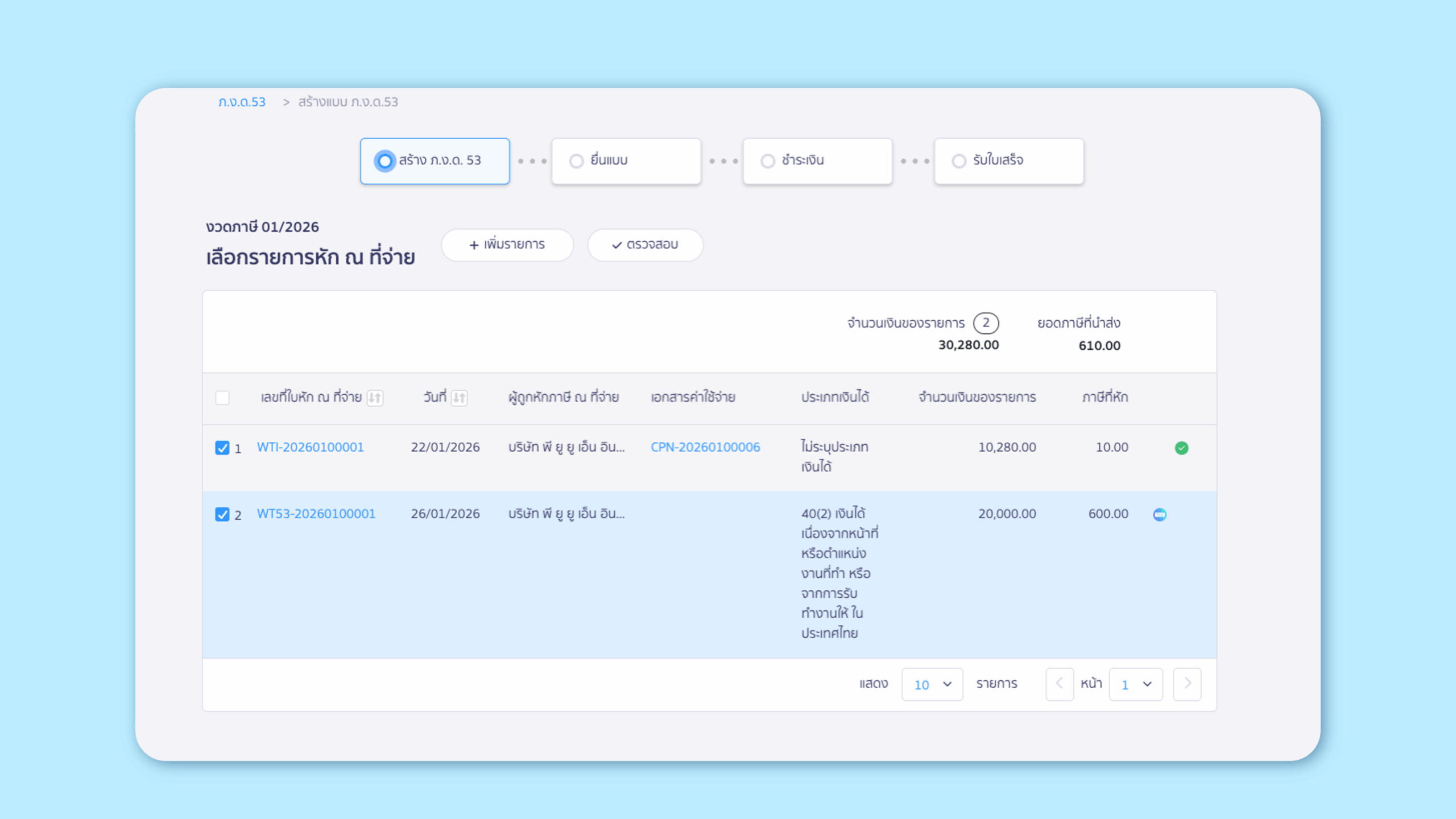 Highlight: ระบบเพิ่มหน้าตรวจสอบรายการภาษีก่อนการสร้างแบบ เพื่อตรวจสอบความครบถ้วนของรายการภาษีอีกครั้งในขั้นตอนหน้าอนุมัติก่อนยื่นแบบ ช่วยให้ผู้ใช้งานเห็นจำนวนรายการถูกต้อง ลดโอกาสข้อมูลตกหล่น และเพิ่มความมั่นใจก่อนสร้างแบบภาษี