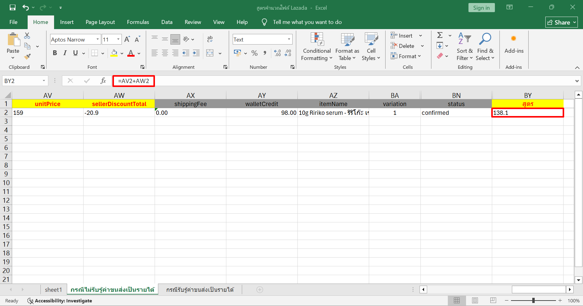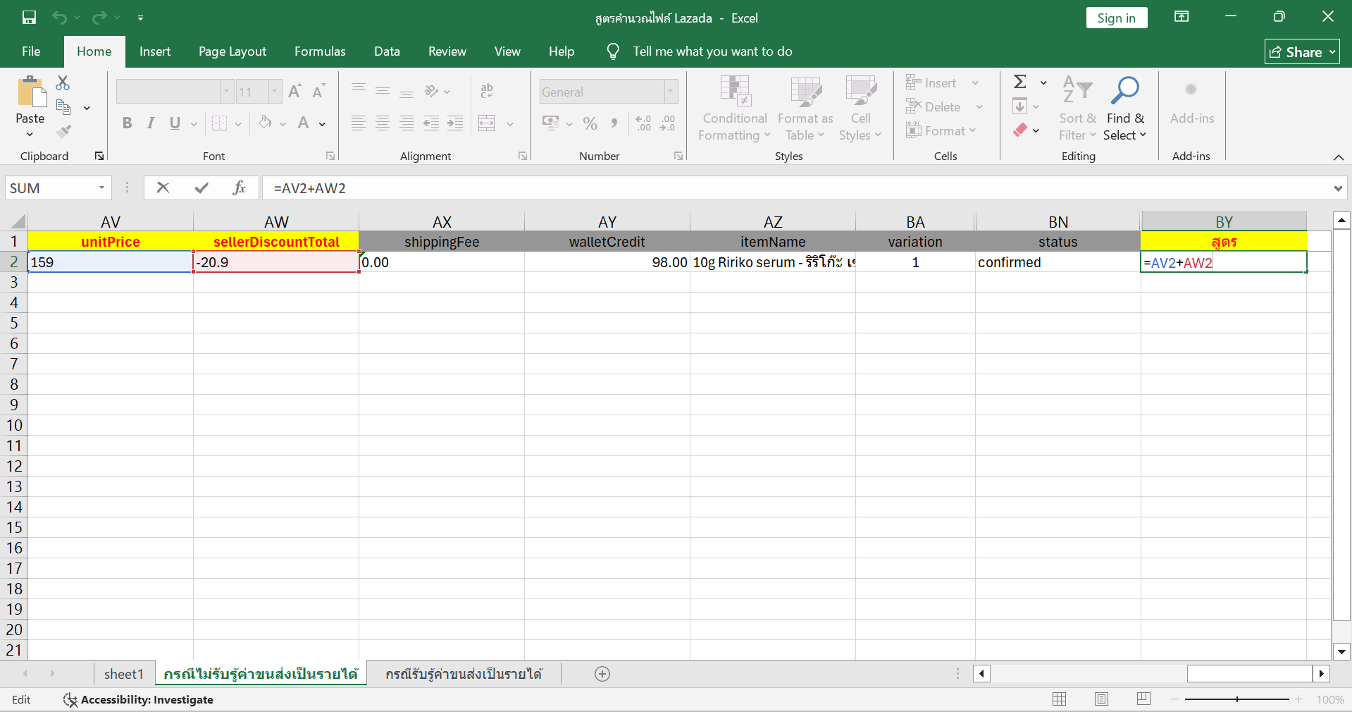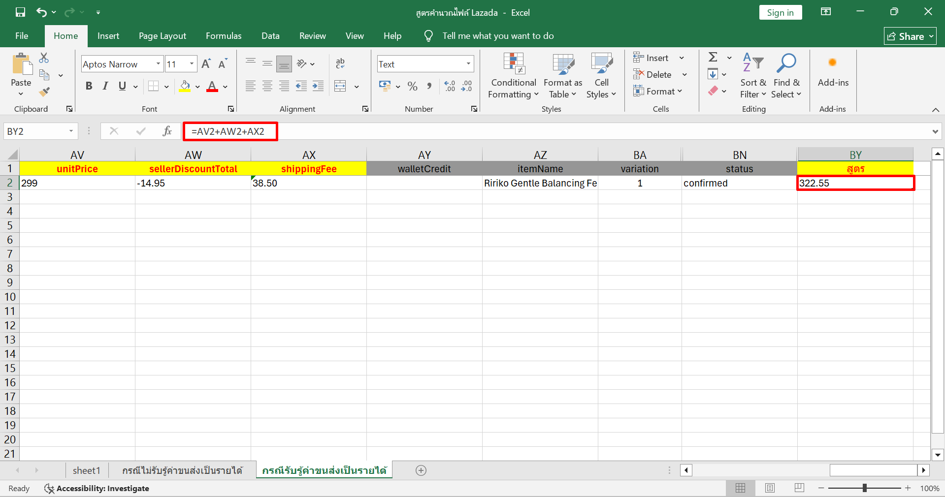 คำนวณสูตรรายได้ จากไฟล์ LAZADA 2 ขั้นตอน ดังนี้