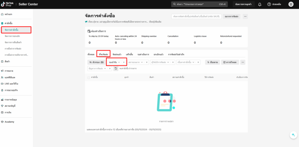 ไปที่เมนู คำสั่งซื้อ > จัดการคำสั่งซื้อ > ไปที่แถบ “ที่จะจัดส่ง” แถบสถานะ “รอเข้ารับ”