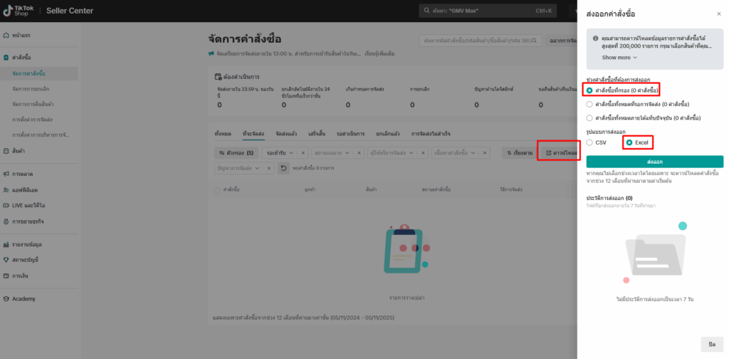 2. การดาวน์โหลดรายงานจาก TikTok Shop