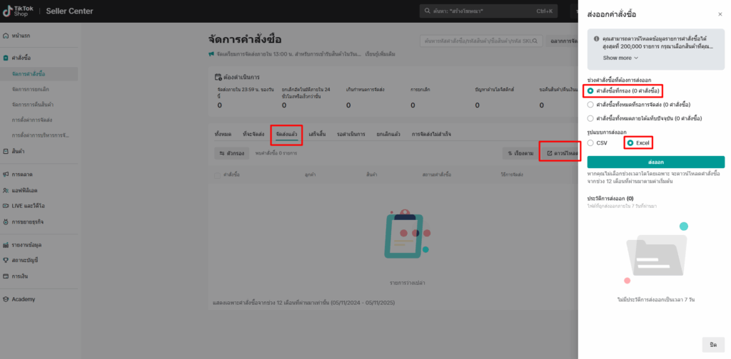 ไปที่เมนู คำสั่งซื้อ > จัดการคำสั่งซื้อ > ไปที่แถบ “จัดส่งแล้ว” แถบสถานะ “ทั้งหมด” จากนั้นกด “ดาวน์โหลด” (สามารถกำหนดช่วงเวลาข้อมูล Order ก่อนกดปุ่มส่งออกคำสั่งซื้อได้)