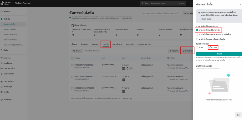 ไปที่เมนู คำสั่งซื้อ > จัดการคำสั่งซื้อ > ไปที่แถบ “เสร็จสิ้น” จากนั้นกด “ดาวน์โหลด” (สามารถกำหนดช่วงเวลาข้อมูล Order ก่อนกดปุ่มส่งออกคำสั่งซื้อได้)