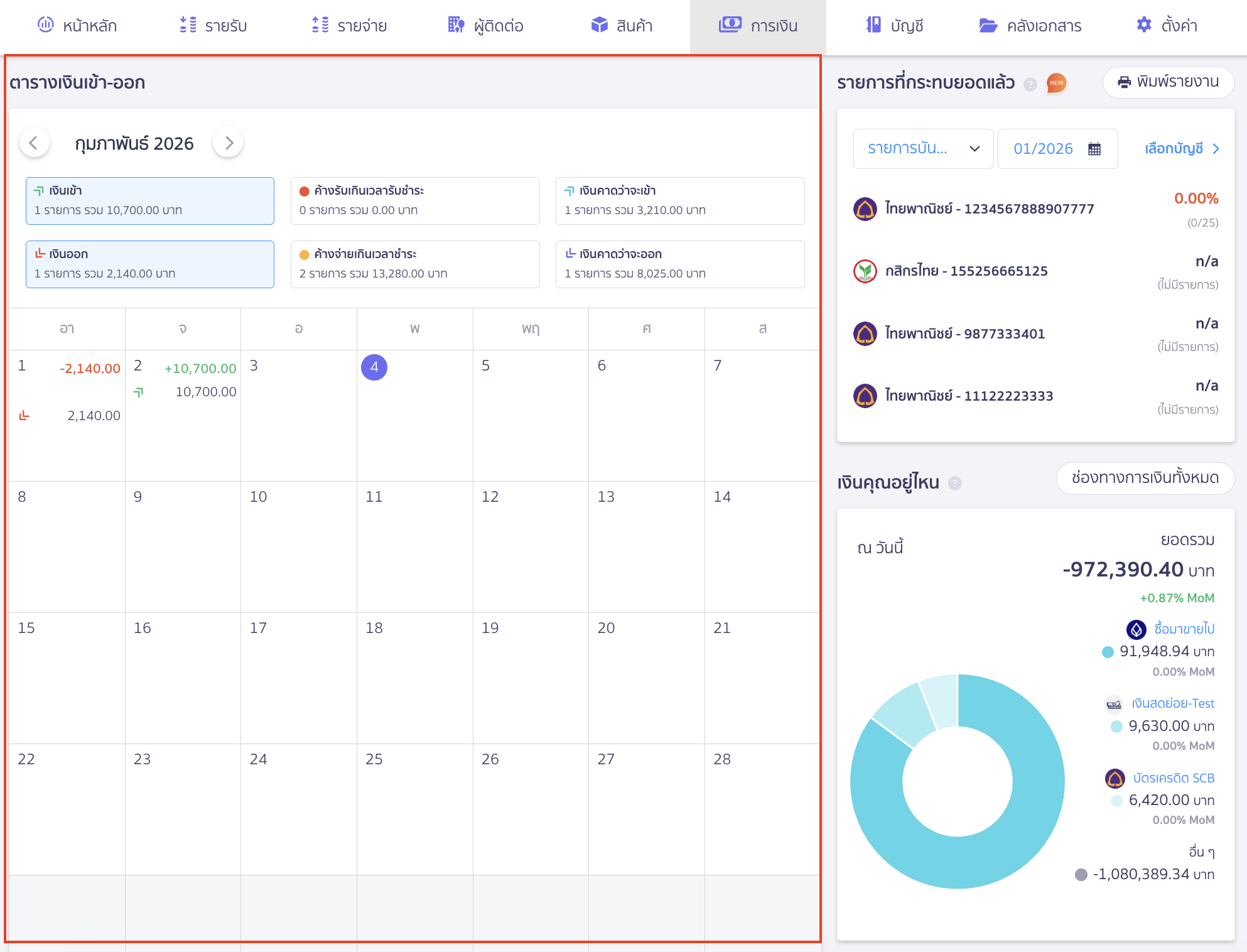 ตัวอย่าง ข้อมูลตารางเงินเข้า-ออก วันจันทร์ที่ 02/02/2026 จะพบว่ามีรายการเงินเข้า 10,700 บาท และมีรายการค้างจ่ายเกินเวลาชำระ 13,280 บาท โดยตัวเลขแถวบนสุดในช่องจะเป็นยอดสุทธิของวันนั้น และสามารถกดดูรายการเอกสารที่ระบบดึงข้อมูลมาให้ได้ จะอยู่ในส่วนแสดงรายละเอียด