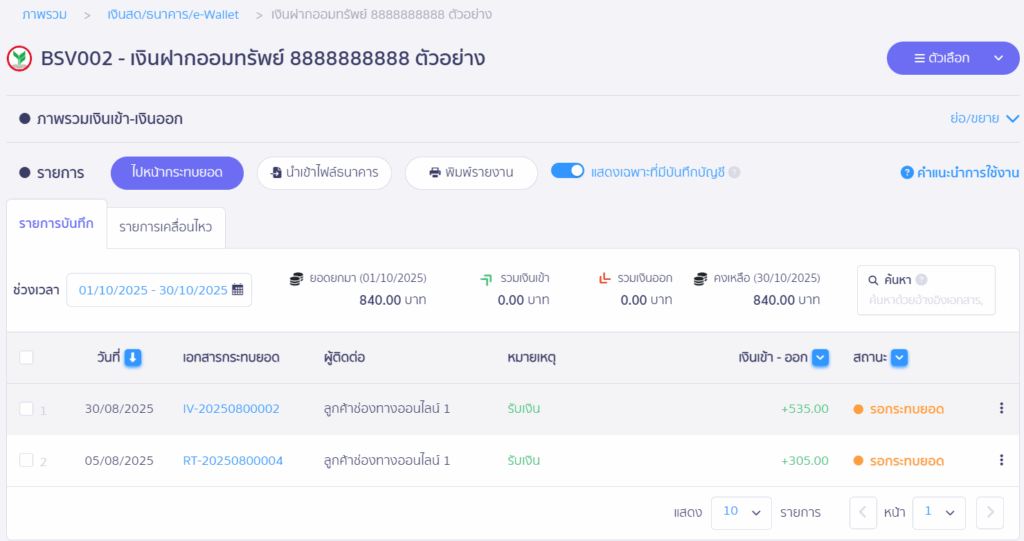 *ในกรณีที่สถานะยังคงเป็นรอกระทบยอดจะไม่แสดงในหน้ารายการในแถบเคลื่อนไหว