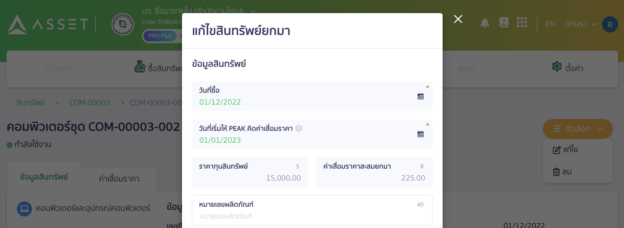 วิธีคิดค่าเสื่อมราคาของสินทรัพย์ ใน PEAK Asset