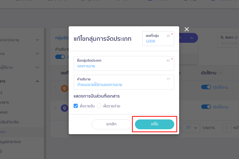 เมื่อกดปุ่มแก้ไขแล้วให้กรอกข้อมูลที่ต้องการแก้ไข และกดปุ่มแก้ไข ระบบจะบันทึกรายการที่แก้ไขให้คุณสามารถ จัดกลุ่มประเภทแบบแยกรายการ ได้ตามที่ต้องการ