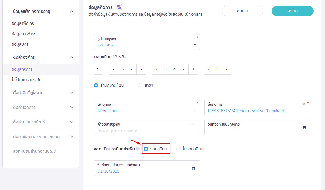 - ทำการติ๊กเครื่องหมายถูกในช่อง “จดทะเบียนภาษีมูลค่าเพิ่ม” เพื่อเปิดใช้งาน