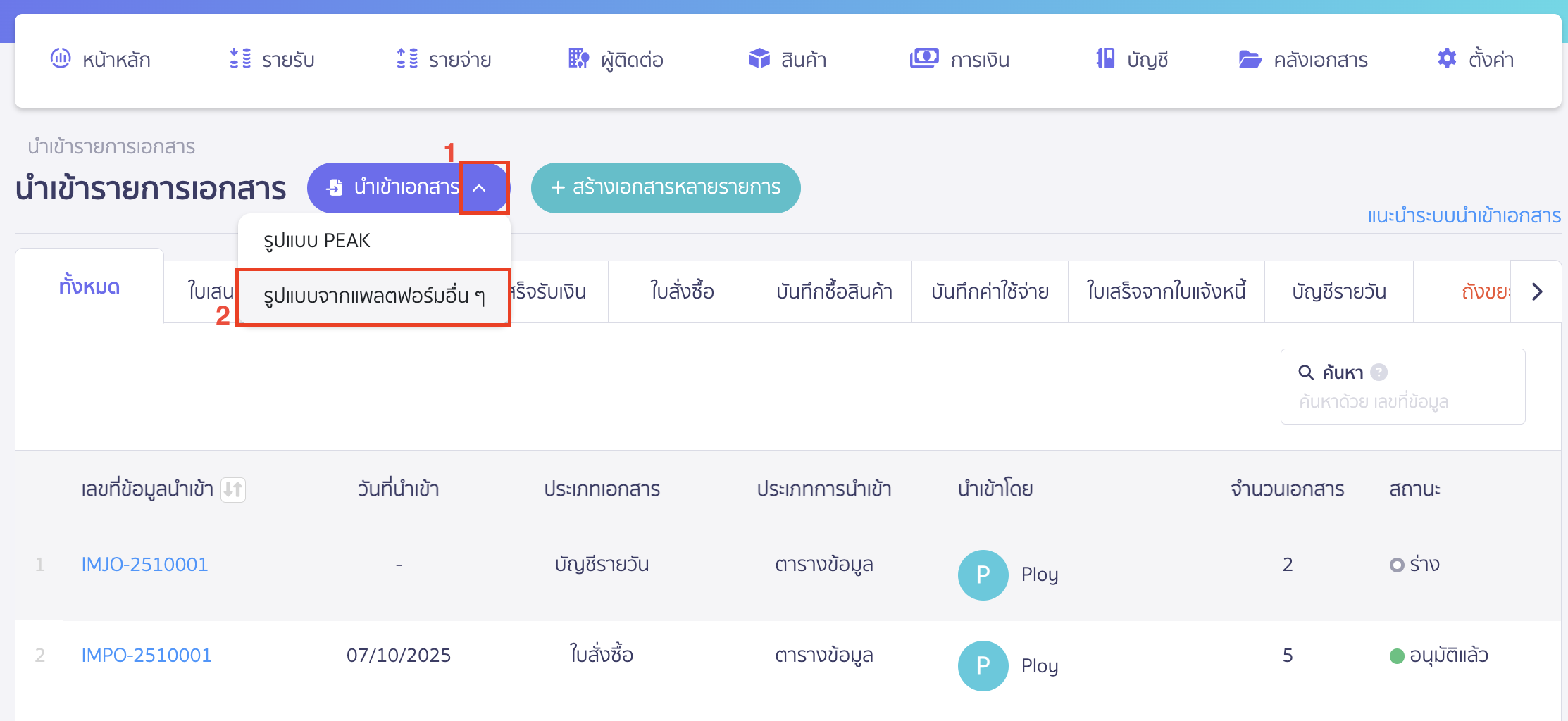 คลิก Drop-down ที่ปุ่ม “นำเข้าเอกสาร” > เลือก รูปแบบจากแพลตฟอร์มอื่นๆ