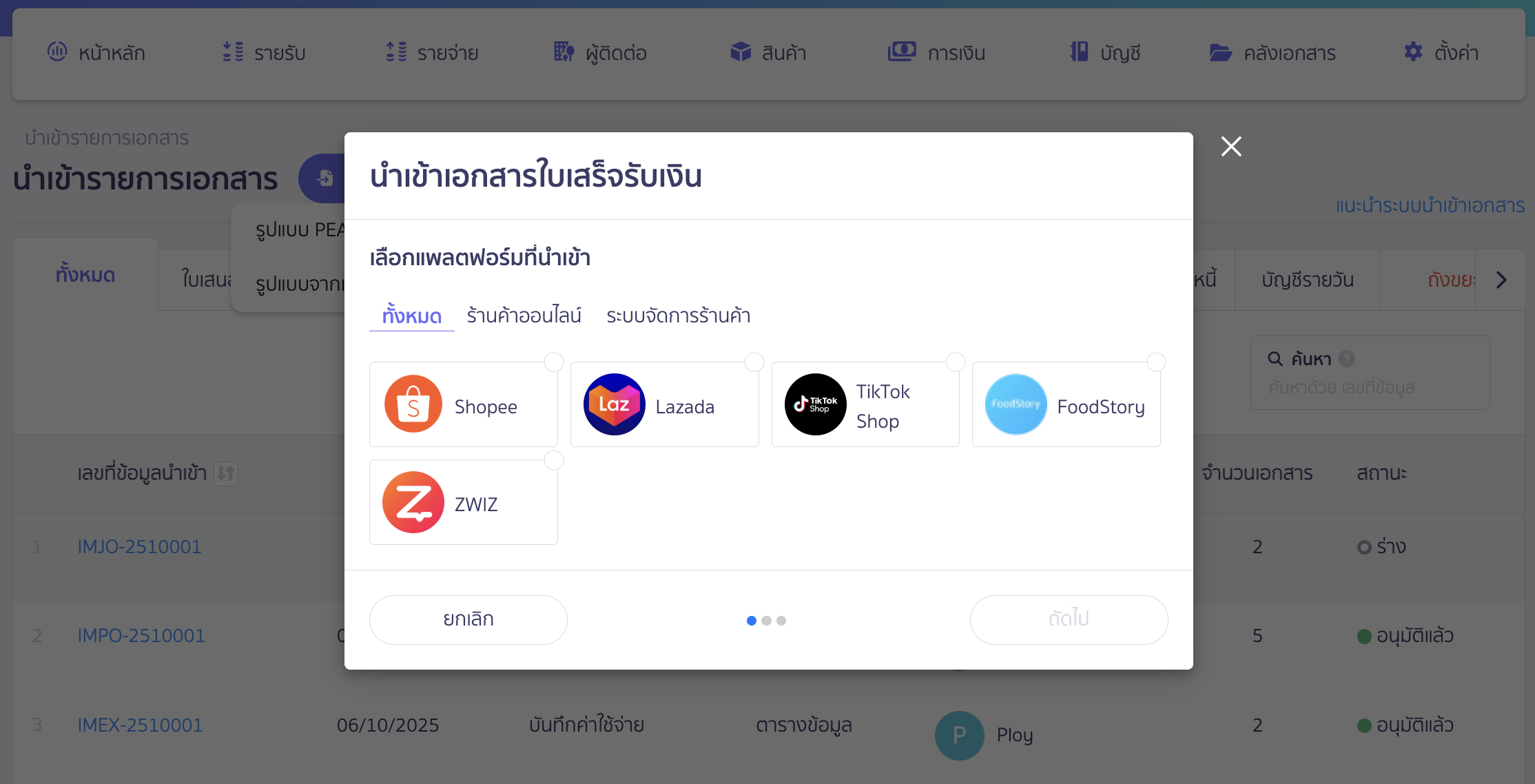 2. วิธีการนำเข้าไฟล์แต่ละแพลตฟอร์มเพื่อสร้างใบเสร็จรับเงินใน PEAK