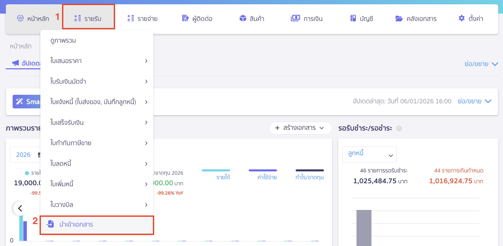 ไปที่เมนูรายรับ > เลือก นำเข้าเอกสาร