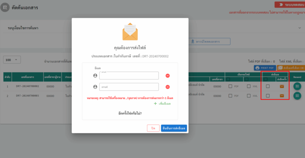 เมื่อกดส่ง e-Tax Invoice เอกสารจะไปแสดงบน INET เพื่อให้ระบุอีเมลของผู้รับอีกครั้ง