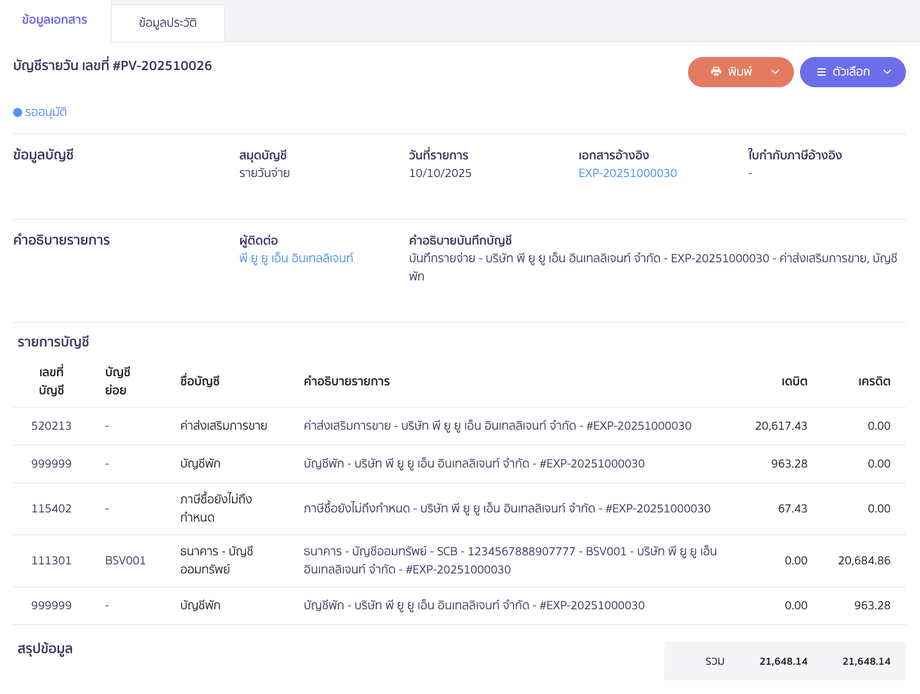 เลือกชื่อผู้ติดต่อ ส่วนของรายการ ทางกิจการสามารถเลือกผังบัญชีตามที่กิจการกำหนด