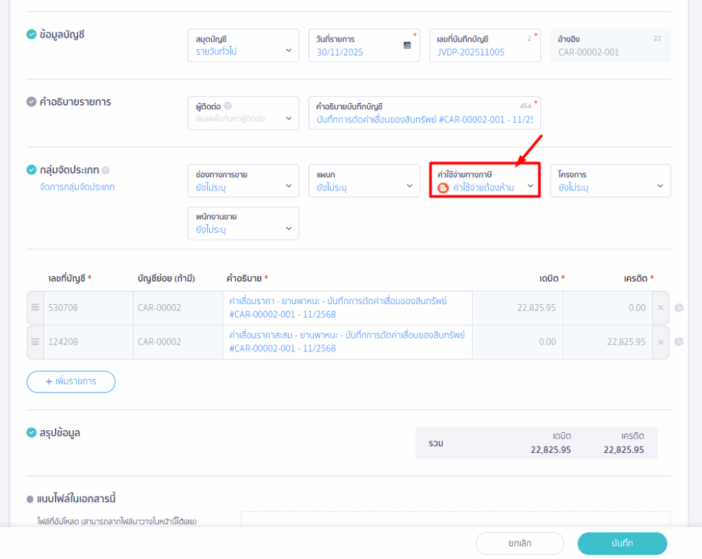 - ซึ่งในส่วนที่เกินจากค่าเสื่อมราคา ที่นำมาเป็นค่าใช้จ่ายได้ 31,682.54 บาท จะต้องถูกบวกกลับในการคำนวณ กำไรสุทธิภาษีเงินได้นิติบุคคล โดยการเข้าไปที่สมุดรายวันและทำการเพิ่มการจัดกลุ่มจัดประเภท เลือกช่องค่าใช้จ่ายทางภาษี และระบุว่าเป็นค่าใช้จ่ายต้องห้าม