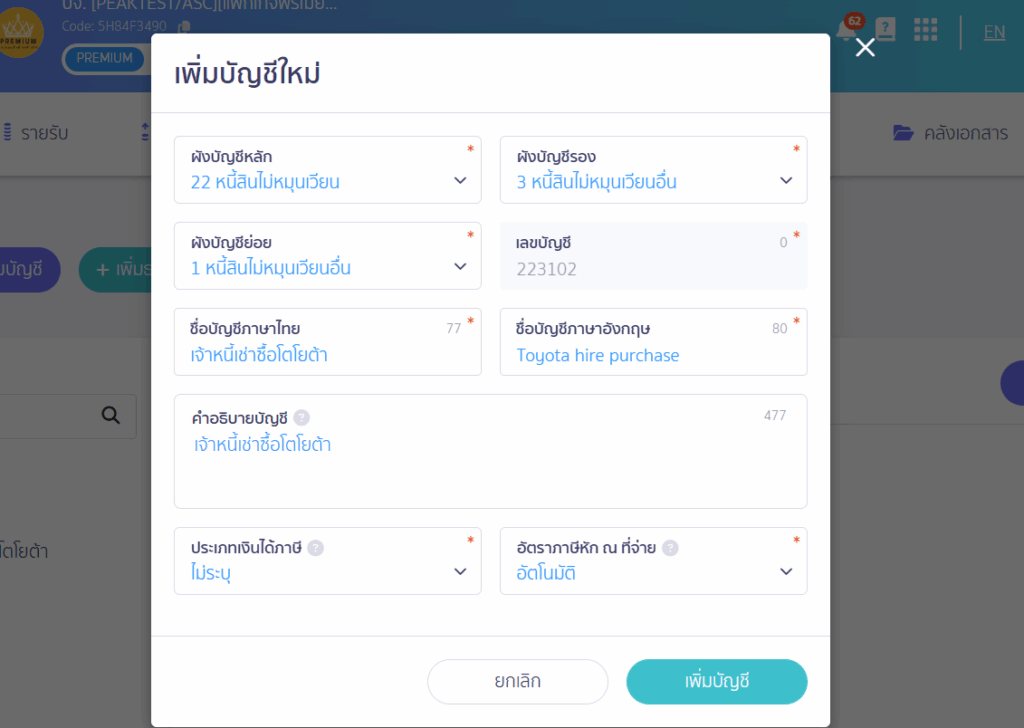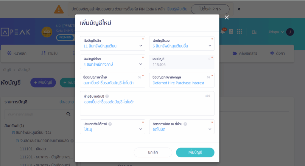 2. บันทึกสินทรัพย์ที่เช่าซื้อบน PEAK