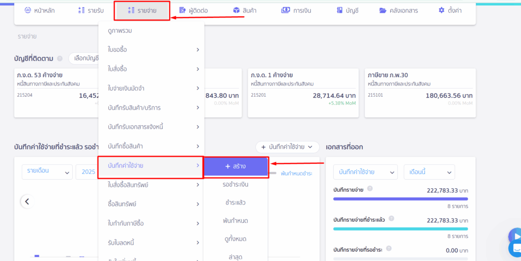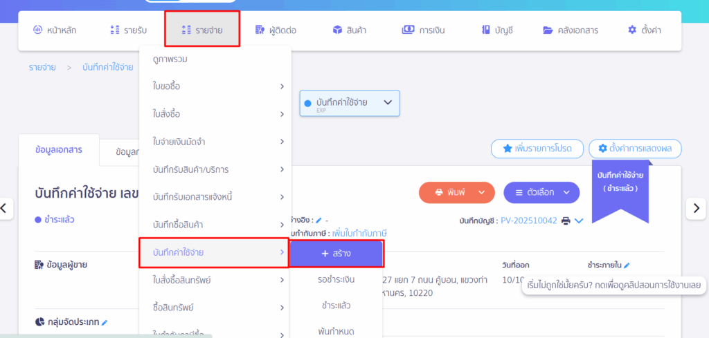 คลิกที่เมนูรายจ่าย > บันทึกค่าใช้จ่าย > กดสร้าง
