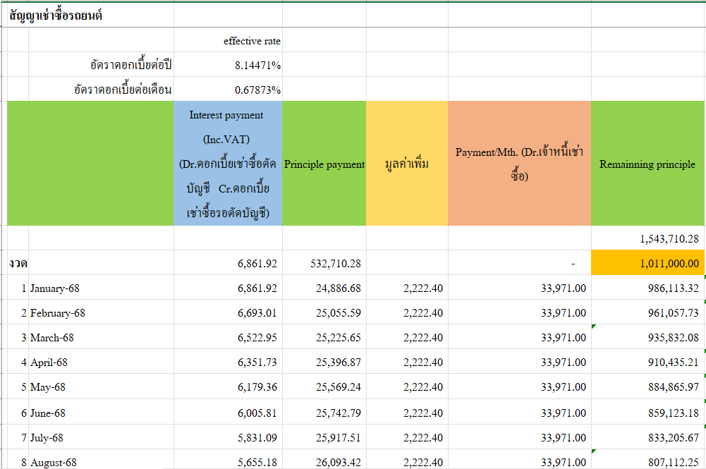 - ดอกเบี้ยจ่าย 6,861.92 บาท (ไม่ระบุ VAT 7%) ยอดบันทึกดอกเบี้ยจ่ายแต่ละเดือนจะไม่เท่ากัน สามารถดูได้ตามรายละเอียดของตารางเช่าซื้อ