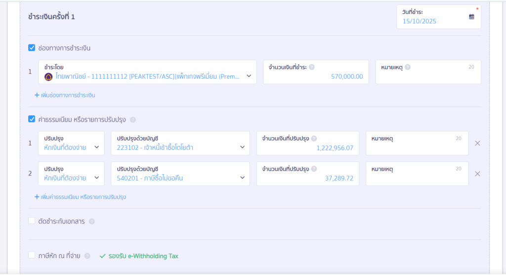 ข้อมูลการชำระเงิน ให้กดปุ่มขั้นสูง > ติ๊กถูกช่องค่าธรรมเนียม หรือรายการปรับปรุง