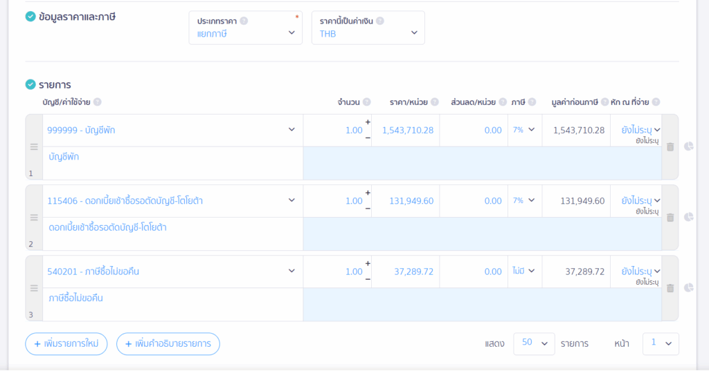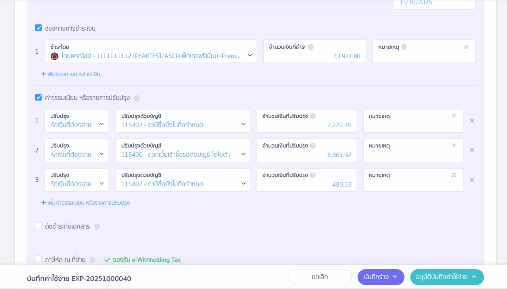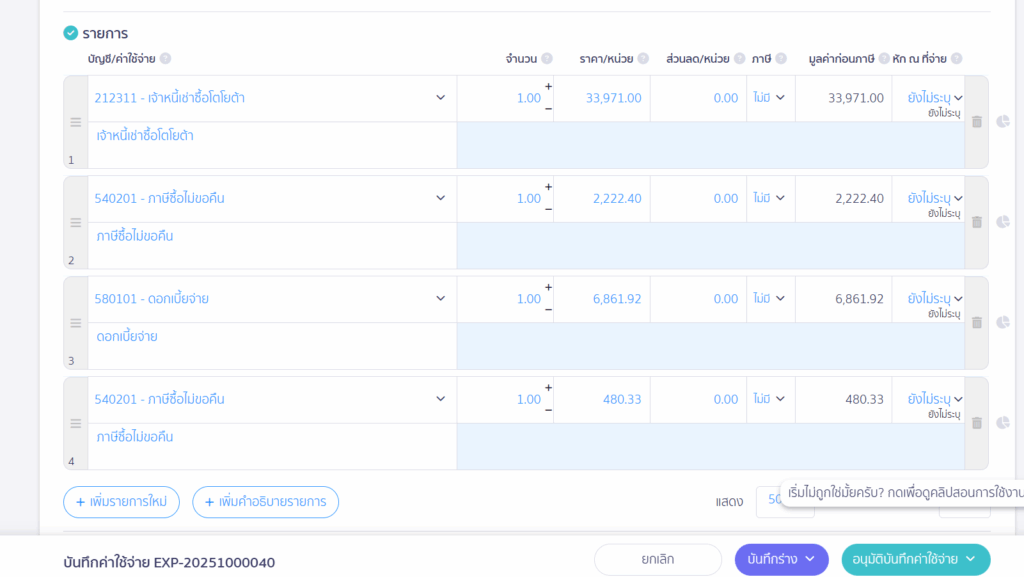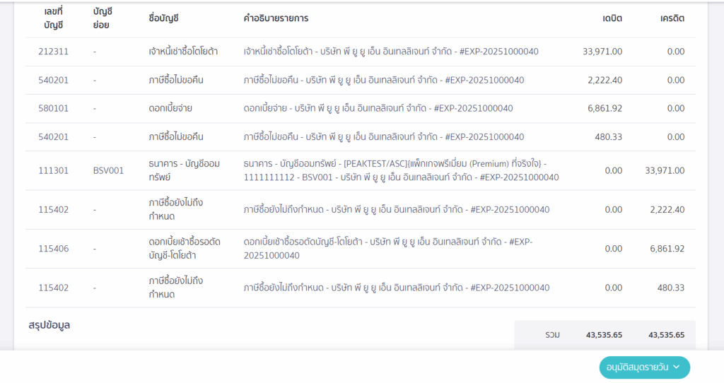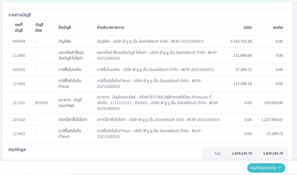 หมายเหตุ การที่ต้องบันทึกรถยนต์เป็นบัญชีพัก เนื่องจากต้องทำการไปบันทึกซื้อสินทรัพย์ เพื่อให้ไปลิงก์กับทะเบียนสินทรัพย์ใน PEAK Asset อีกครั้ง