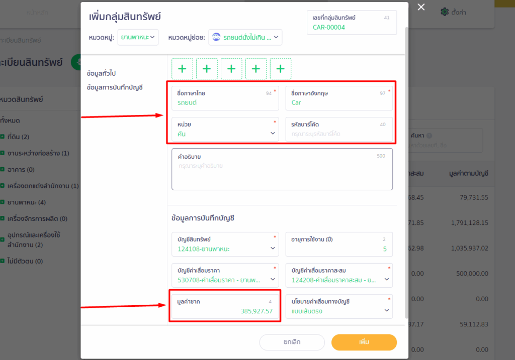 ทำการเพิ่มรายละเอียดกลุ่มสินทรัพย์ โดยระบุเป็นรถยนต์ และใส่ยอดมูลค่าคงเหลือไว้ที่ มูลค่าซาก 385,927.57 บาทที่คำนวณไว้เมื่อสักครู่