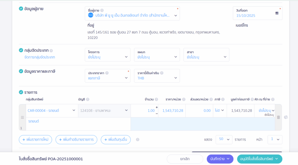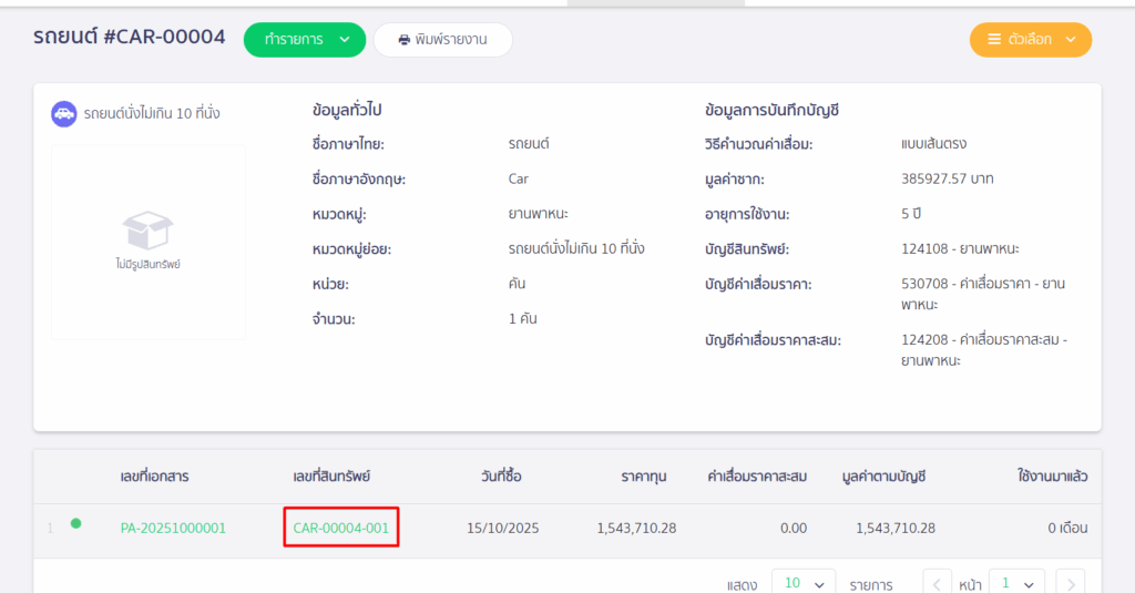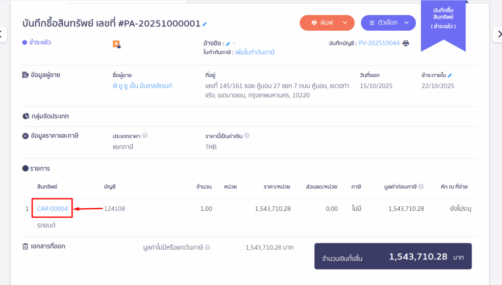 เมื่อบันทึกซื้อสินทรัพย์ ระบบจะลิงก์ไปบันทึกที่ทะเบียนสินทรัพย์บน PEAK ASSET ให้อัตโนมัติ โดยคลิกที่เลขกลุ่มสินทรัพย์