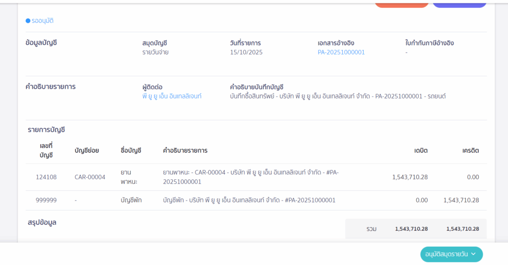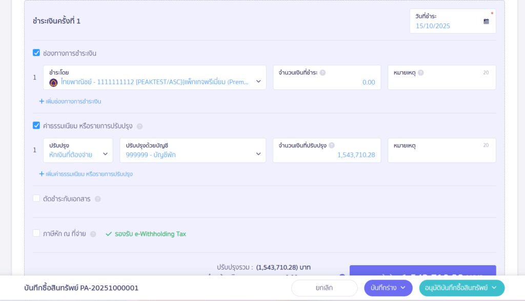บันทึกซื้อสินทรัพย์ด้วยราคาเต็ม 1,543,710.28 บาท