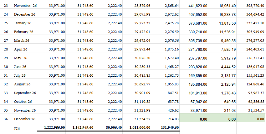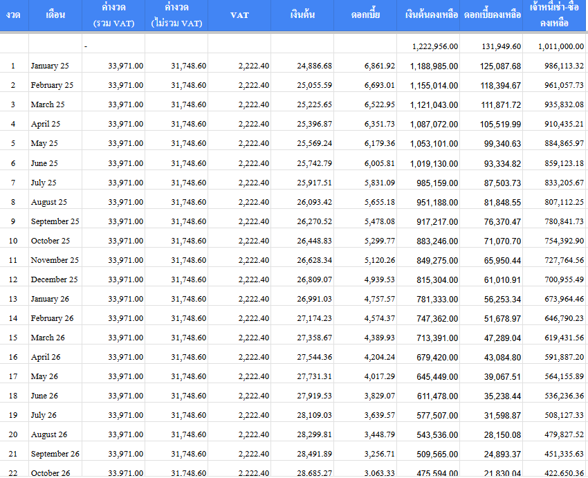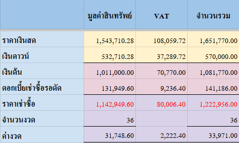 - งวดละ 31,748.60 บาท ภาษีมูลค่าเพิ่ม 2,222.40 บาท รวม 33,971.00 บาท