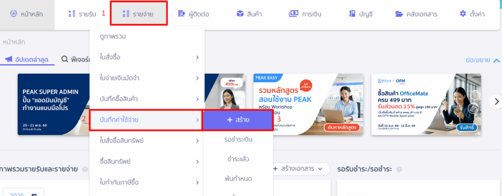 บันทึกจ่ายค่างวดรถที่ PEAK โดยเข้าเมนูรายจ่าย > บันทึกค่าใช้จ่าย > จากนั้นกด “สร้าง”