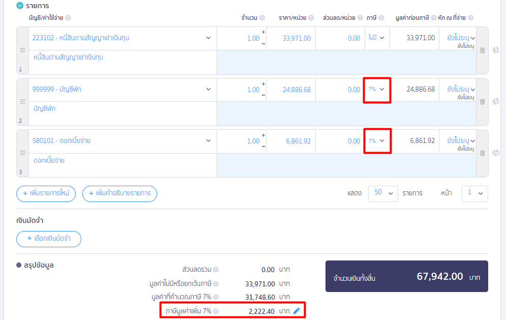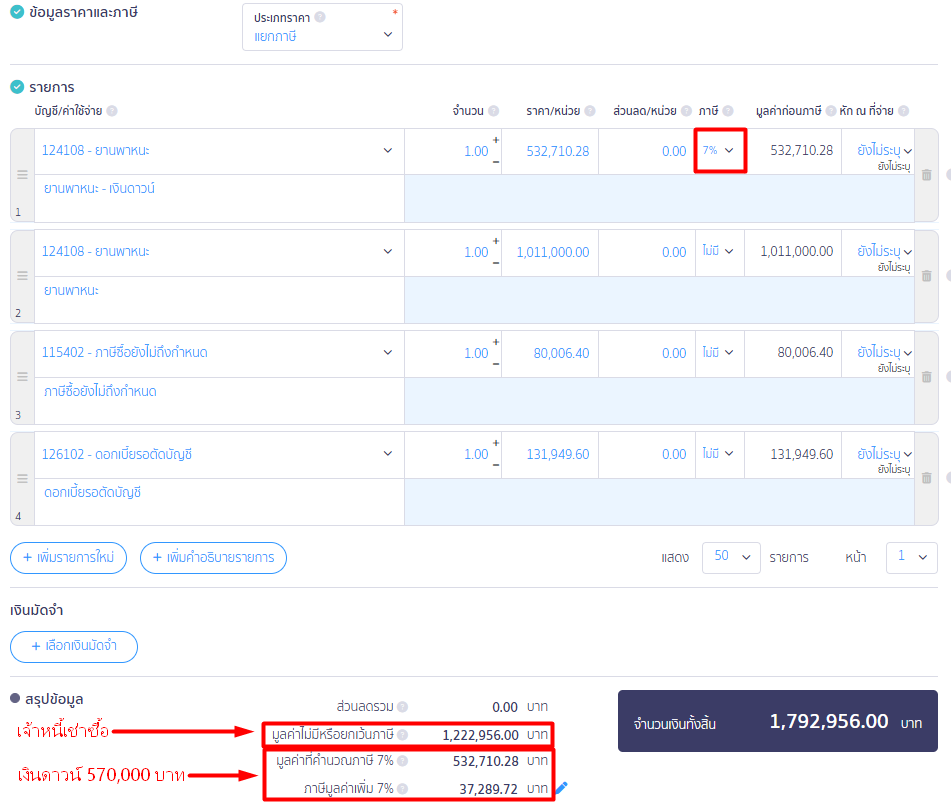 - บรรทัดที่ 1 : เงินดาวน์ (ถ้ามี) และหากต้องการใช้ภาษีซื้อของเงินดาวน์ภายหลังให้ระบุช่อง ภาษีเป็น 7% (ระบบจะบันทึกเป็น Dr. ภาษีซื้อไม่ถึงกำหนด ไว้จนกว่าจะมีการลงทะเบียนภาษีซื้อ)