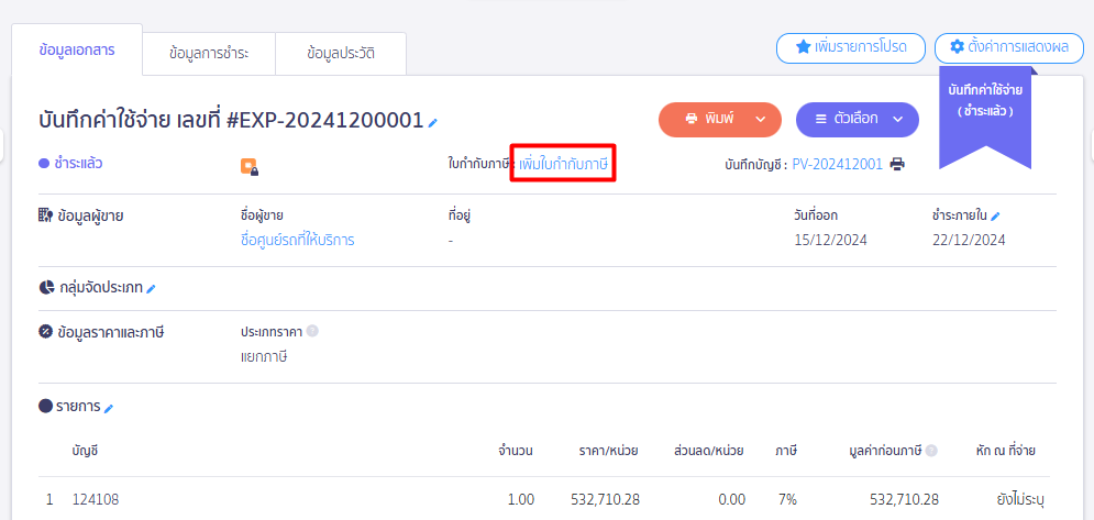 หากต้องการใช้ภาษีซื้อของเงินดาวน์ ให้ทำการลงทะเบียนภาษีซื้อ โดยกด “เพิ่มใบกำกับภาษี”