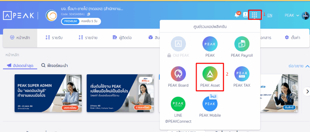 กดปุ่มแอปพลิเคชั่นเซ็นเตอร์ เข้า PEAK Asset