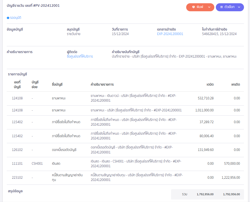 - ตัวอย่างข้อมูลการบันทึกบัญชีค่างวดรถ
