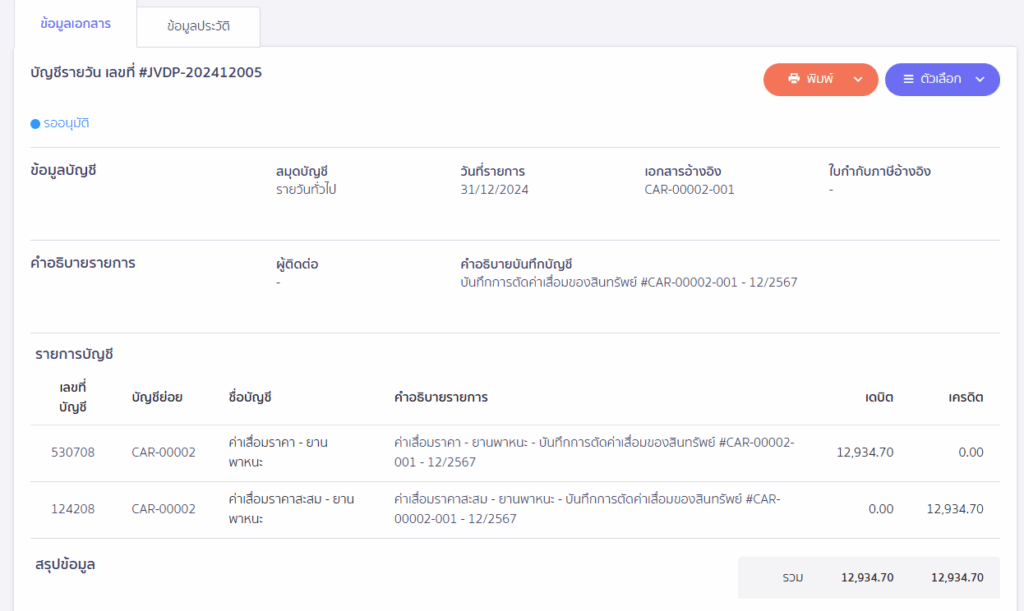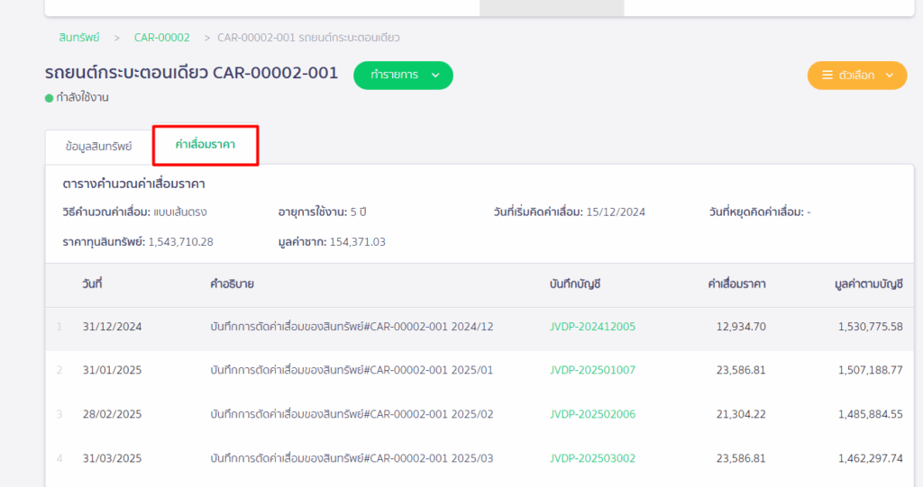 เมื่อกดยืนยันระบบจะทำการบันทึกค่าเสื่อมราคาให้อัตโนมัติ สามารถดูได้โดยการกดที่สินทรัพย์ เลือกค่าเสื่อมราคา