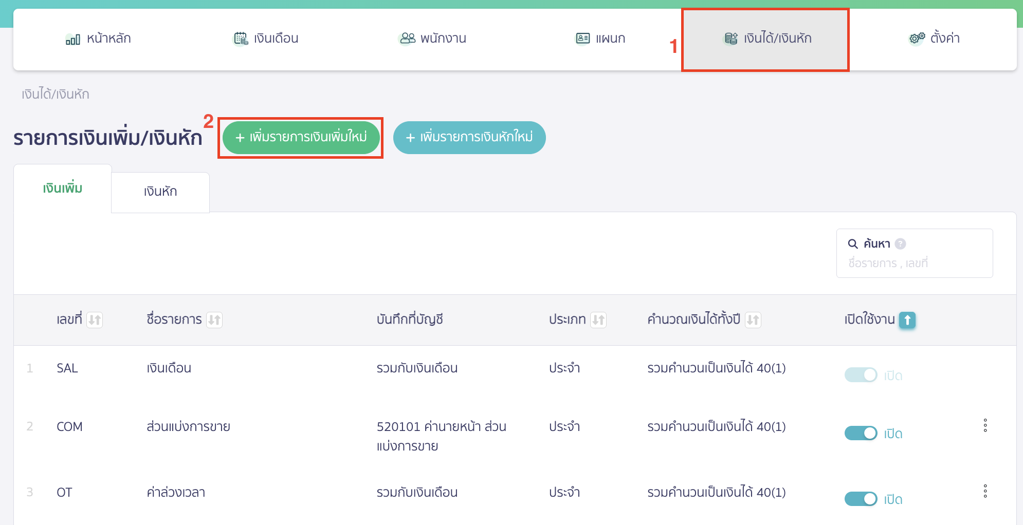 ไปที่เมนูเงินได้/เงินหัก > คลิกปุ่ม “เพิ่มรายการเงินเพิ่มใหม่”