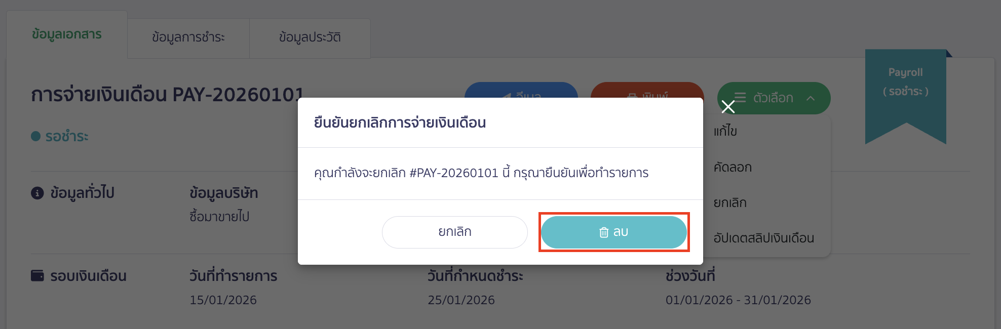คลิกปุ่ม “ลบ” เพื่อยืนยันการยกเลิกเอกสารการจ่ายเงินเดือนอีกครั้ง