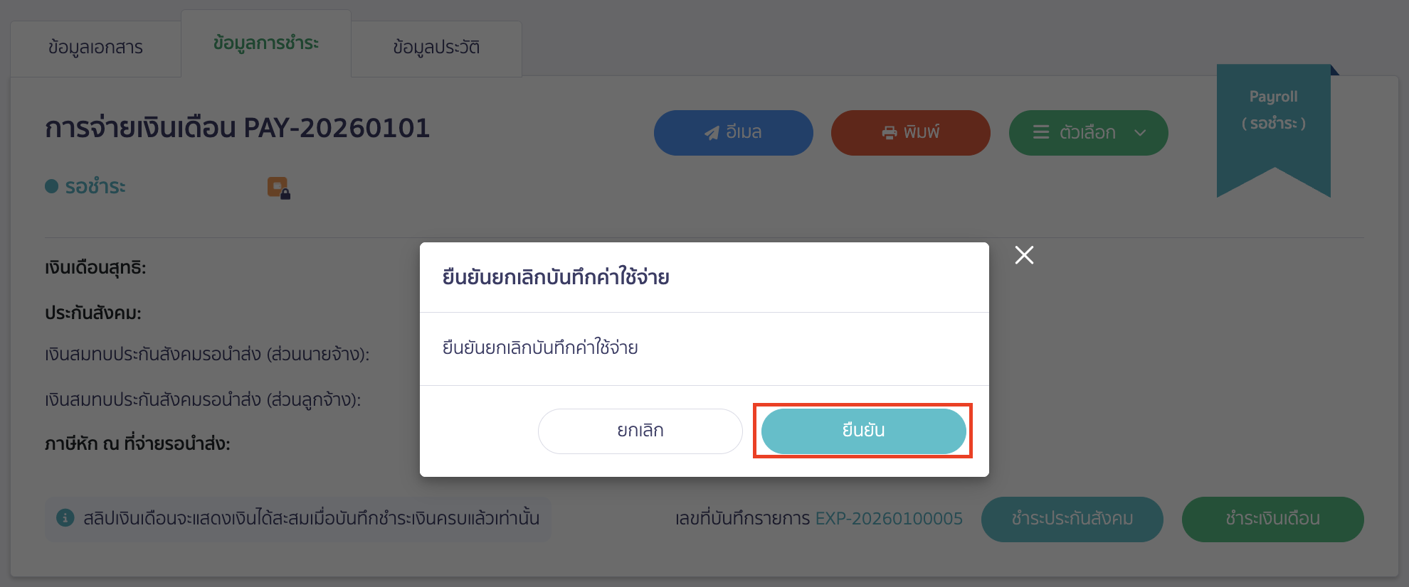 คลิกปุ่ม “ยืนยัน” เพื่อยืนยันการยกเลิกสรุปจ่ายเงินเดือน