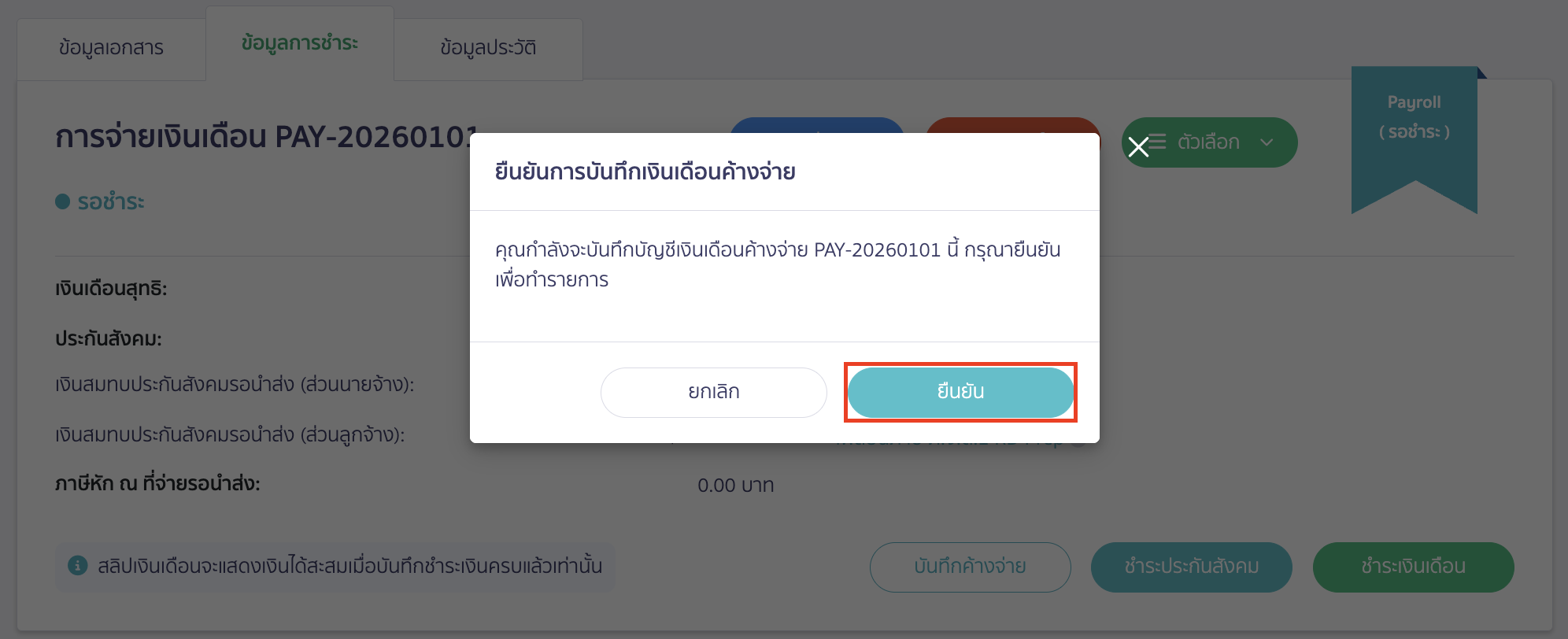 หลังจากที่กดอนุมัติเงินเดือนแล้ว สามารถแบ่งจ่ายชำระแบบหลายครั้งได้ โดยการกดเข้าที่หน้าข้อมูลการชำระ > คลิกปุ่ม “บันทึกค้างจ่าย”