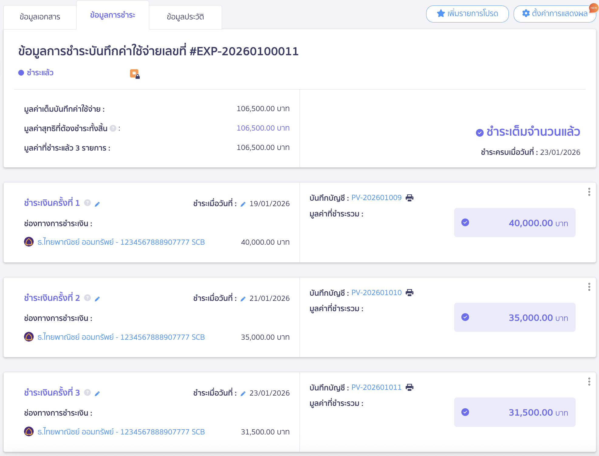 ระบบจะนำมาที่หน้าบันทึกค่าใช้จ่ายให้อัตโนมัติ > จากนั้นไปที่หน้าข้อมูลการชำระ
