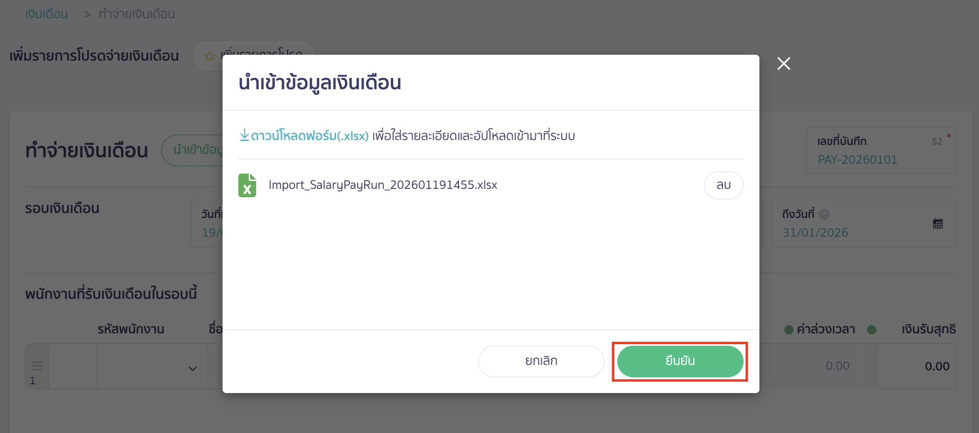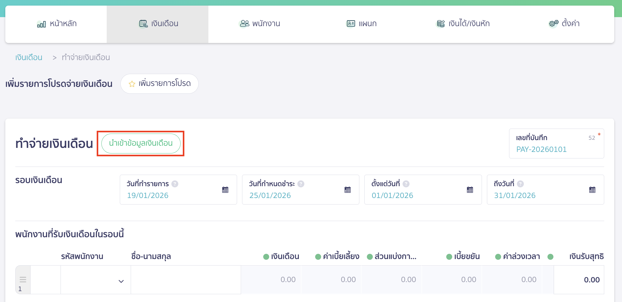 คลิกปุ่ม “นำเข้าข้อมูลเงินเดือน”