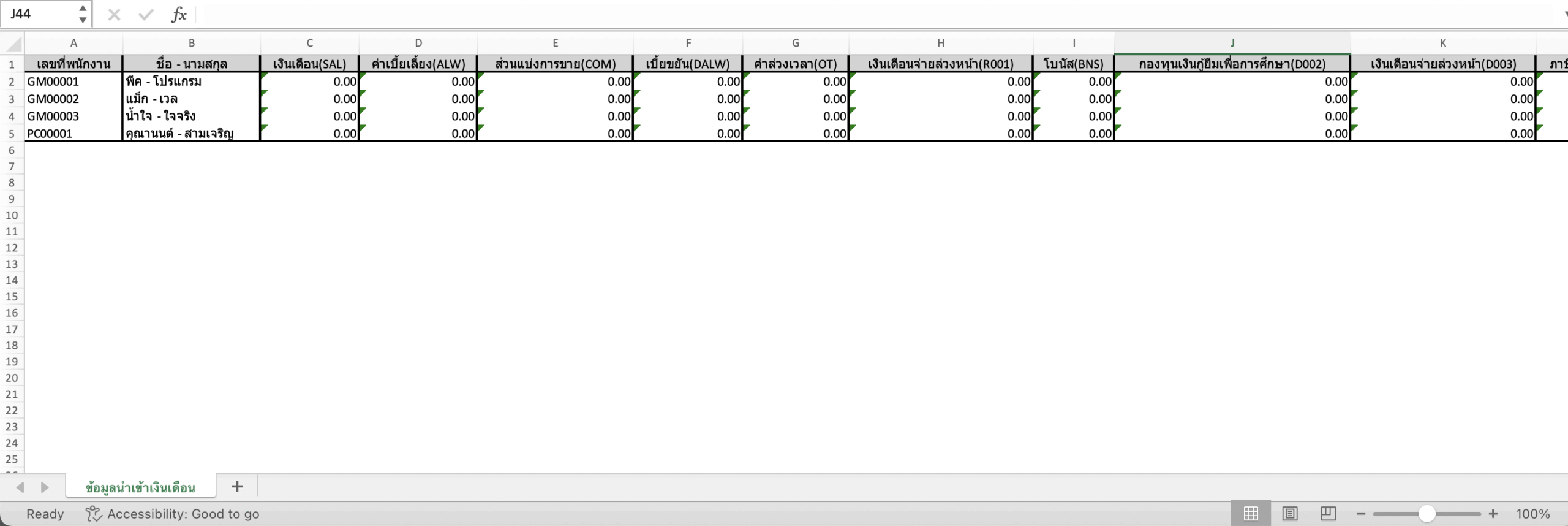กรอกรายละเอียดของรายการ เช่น รหัสพนักงาน เงินเดือน ค่าเบี้ยเลี้ยง เป็นต้น