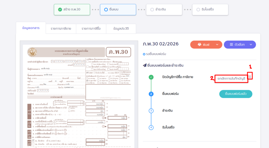 และทำการกดไอคอนจุด 3 จุด > เลือก ยกเลิกรายการ จนครบทุกรายการแล้ว ระบบจะทำการยกเลิกรายการบันทึกรายจ่าย และรายการปิดบัญชีภาษีซื้อ ภาษีขายให้โดยอัตโนมัติ