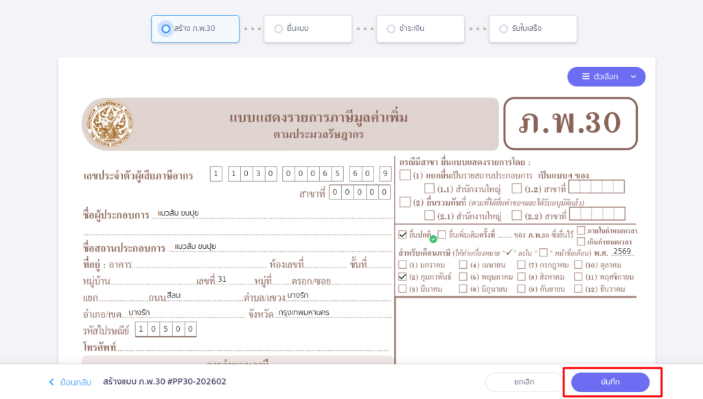เมื่อทำการแก้ไขรายการภาษีขายหรือซื้อเรียบร้อยแล้ว ให้กลับมาที่หน้าแบบ ภ.พ.30 โดยคลิกปุ่ม “ต่อไป”