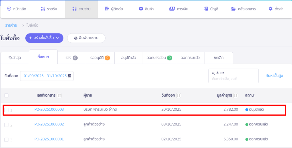 ไปที่เมนูรายจ่าย > ใบสั่งซื้อ > ดูทั้งหมด