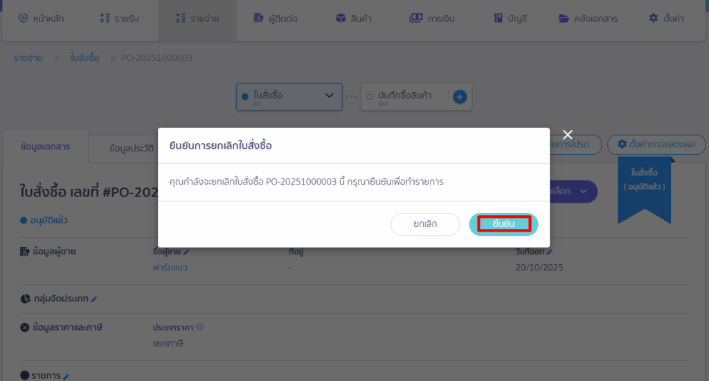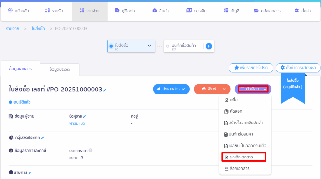 ยกเลิกใบสั่งซื้อ กรณียังไม่ได้บันทึกรายจ่าย ใน PEAK
