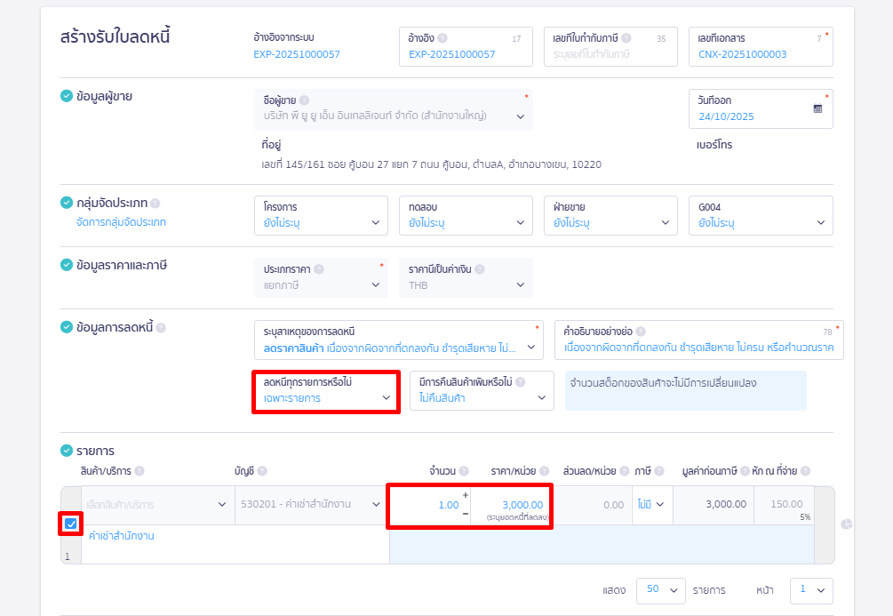 - ระบุสาเหตุของการลดหนี้: เลือกเหตุผลที่ใกล้เคียงที่สุด เช่น สินค้าชำรุด, คำนวณราคาผิด หรือเลือกหัวข้อ “อื่นๆ” หากไม่มีในตัวเลือกตามที่ต้องการ