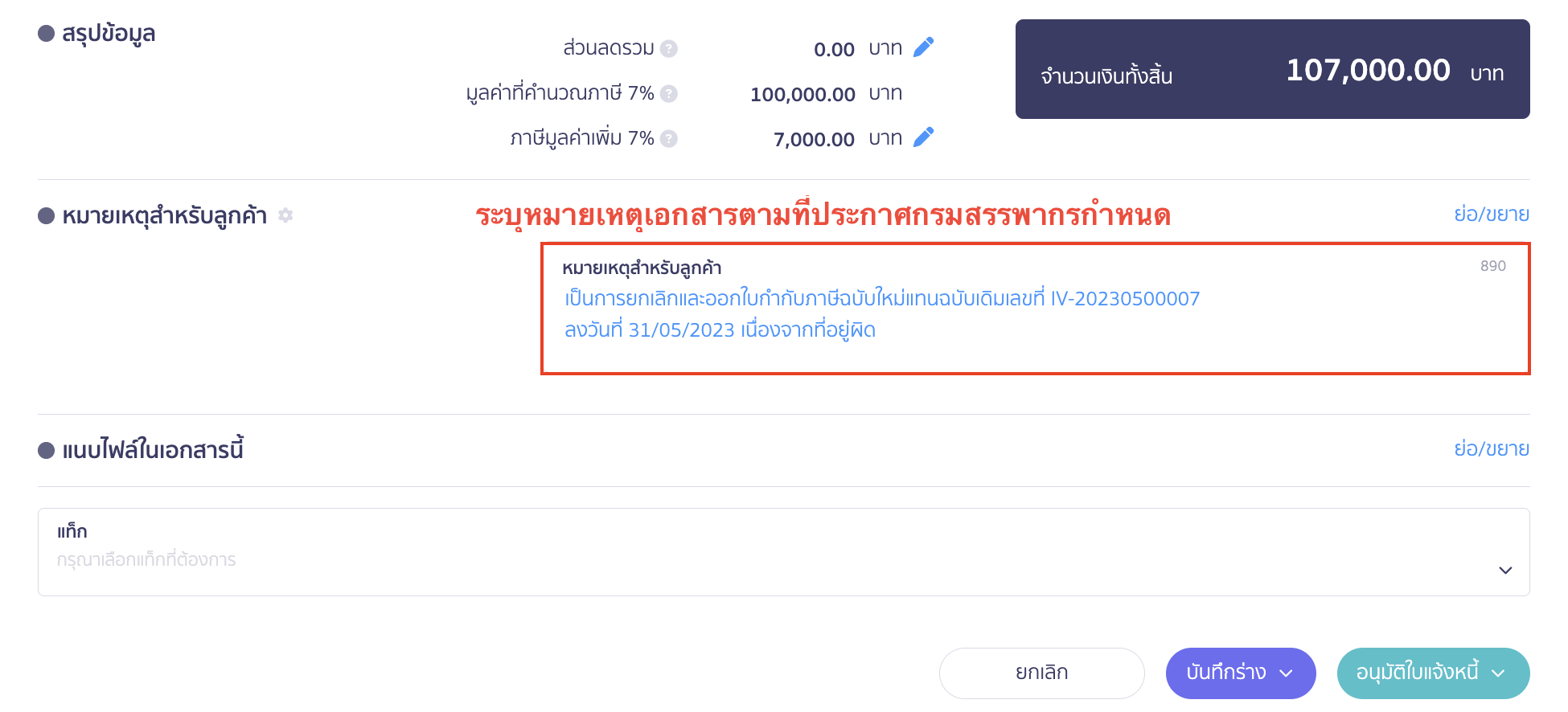 หมายเหตุเอกสารระบุ: เป็นการยกเลิกและใบกำกับภาษีฉบับใหม่แทนฉบับเดิมเลขที่ IV-20230500007 ลงวันที่ 31/05/2023 เนื่องจากที่อยู่ผิด