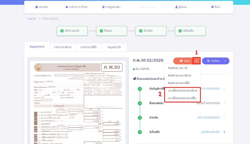 เมื่อทำการสร้างแบบ ภ.พ.30 ที่ PEAK Tax เรียบร้อยแล้ว สามารถดูขั้นตอน พิมพ์รายงานภาษีขาย/ภาษีซื้อ เป็นไฟล์ Excel ได้ตามขั้นตอนต่อไปนี้